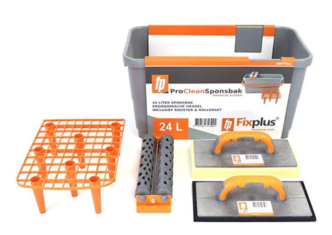 Tijdens en vooral na het voegen van tegelwerk kunnen verschillende hulpmiddelen goed van pas komen. Zo is de Fix Plus Pro Clean Sponsbak eigenlijk onmisbaar bij het achteraf schoonmaken van je tegelwerk. Na het invoegen van de tegels is het namelijk belangrijk om het tegelwerk te reinigen. Hierdoor wordt voorkomen dat er een (lastig te verwijderen) cementsluier achterblijft op de tegels.